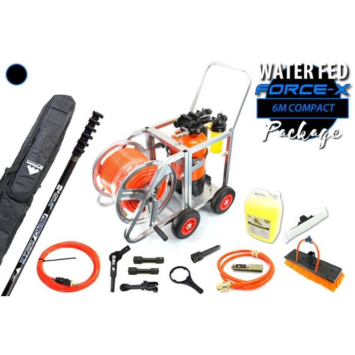 “DeVito Package” Residential & Commercial Cleaning Package – 12.5L GO H2O Pro DI System with detergent dispenser on all-in-one trolley with removable compact hose reel & 80m hose, 100% carbon fibre 6m super compact Force-X pole, 12” brush, pole bag, and everything else you need!
